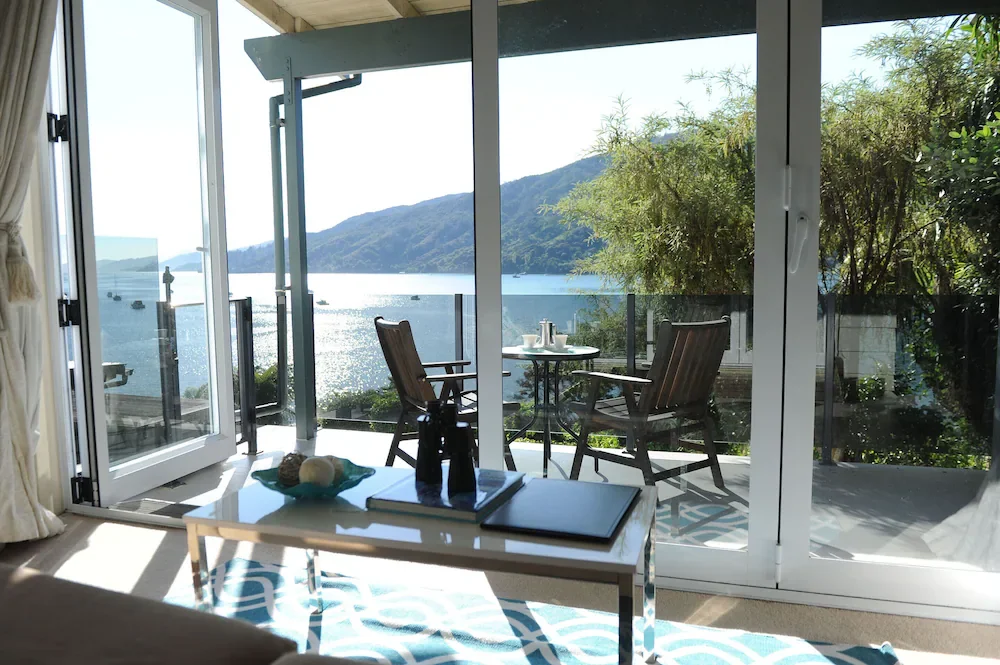 Beyond the covered area, the open deck and garden offer uninterrupted views down Queen Charlotte Sound. Enjoy a glass of Marlborough wine at sunset, listen to the native birds, or simply breathe in the quiet beauty of Anakiwa.